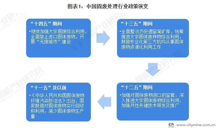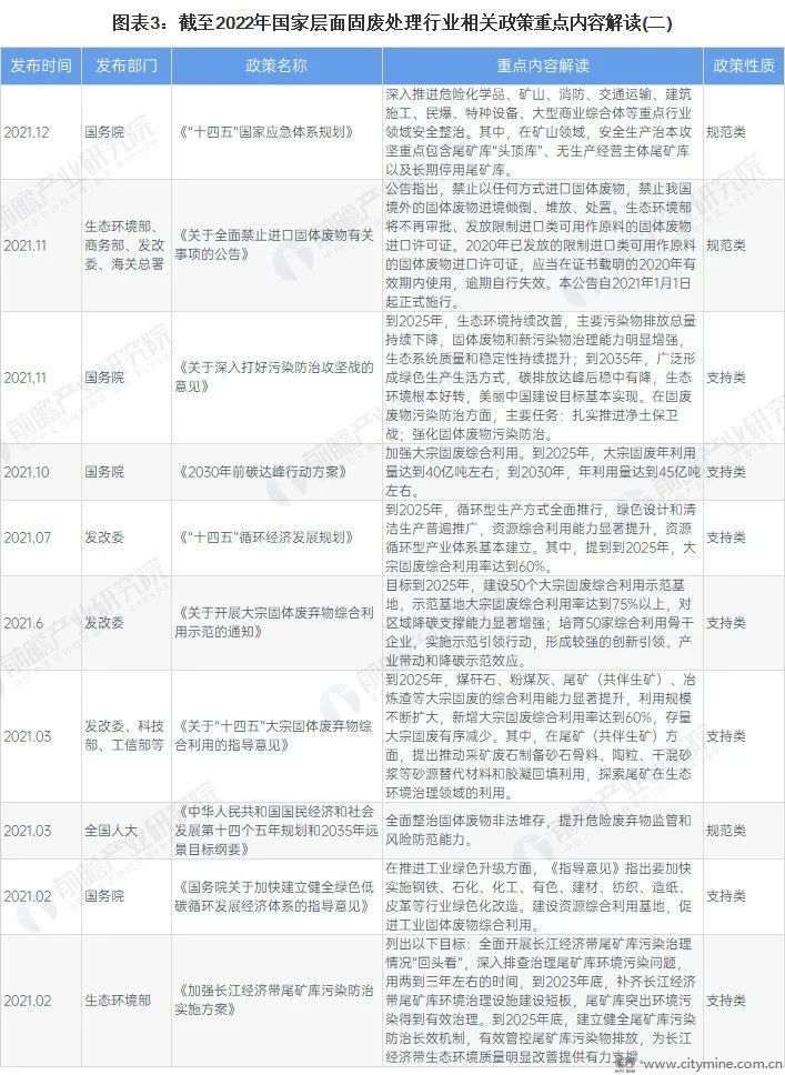 2005年,《中华人民共和国固体废物环境污染防治法》正式实施,“十一五”期间国家政策主要鼓励对固体废物实行回收和利用、减少固体废物生产量;“十二五”时期,《关于建立完整的先进的废旧商品回收体系的意见》出台,我国开始加强对固体废物进口的监管,同时深入推进大宗固体废物综合利用,加强共性关键技术研发及推广;“十三五”时期,《“无废城市”建设试点工作方案》、《工业固体废物资源综合利用评价管理暂行办法》等政策出台,提出要全面整治历史遗留尾矿库,统筹推进大宗固体废弃物综合利用,鼓励专业化第三方机构从事固体废物资源化利用相关工作;“十四五”以来,低碳化进程推进的带动下,固废处理相关国家政策进一步优化,支持力度进一步加大,全面禁止进口固体废物,继续加强大宗固废综合利用,大力开展“无废城市”建设,固废处理行业发展进入快车道。