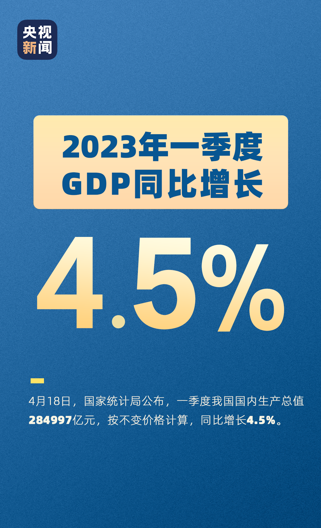4月18日上午,国家统计局发布2023年一季度国民经济运行数据:国内生产总值:一季度国内生产总值284997亿元,同比增长4.5%;