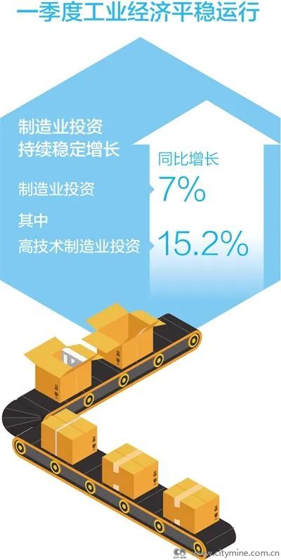 工业生产稳步回升,一季度规模以上工业增加值同比增长3%,其中制造业增加值同比增长2.9%,比去年12月份增速加快2.7个百分点。制造业投资持续稳定增长,一季度制造业投资同比增长7%,高于全国固定资产投资1.9个百分点,其中高技术制造业投资同比增长15.2%。