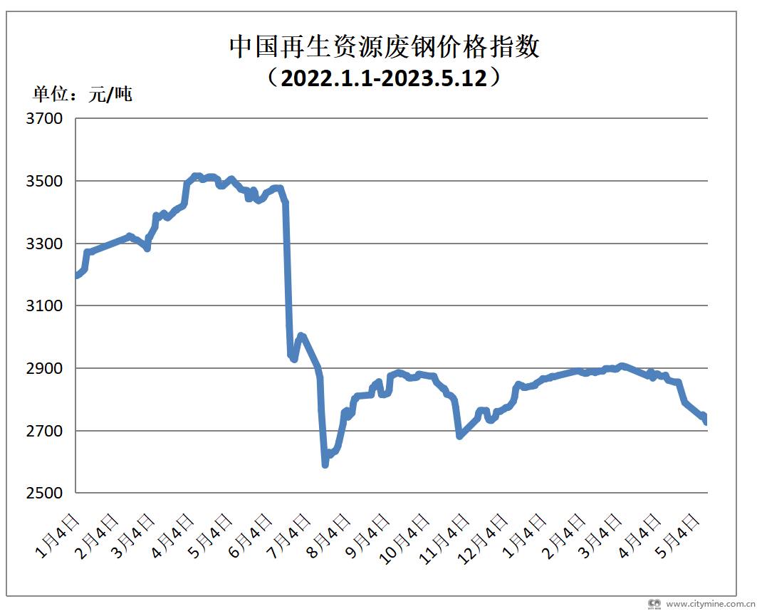 今日中国再生资源废钢价格指数2734元/吨,较上交易日下跌12元/吨。今废钢弱势运行。西南地区加权平均价格为2497元/吨,较上期价格跌45元/吨。今日盘面弱势,市场信心受挫,钢企积极下调价格,本地市场价格跟跌,短期市场仍弱势运行。