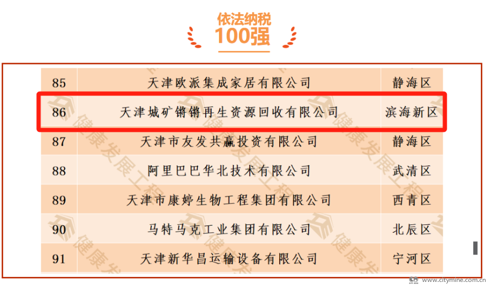 2023年11月13日 2023年11月9日,第十二届天津市民营经济健康发展工程榜单发布,天津拾起卖科技集团有限公司(以下简称“拾起卖科技集团”)旗下天津城矿锵锵再生资源回收有限公司上榜“依法纳税100强”。据《第十二届天津市民营经济健康发展工程研究报告摘要》显示,今年依法纳税100强上榜门槛为0.9亿元。从行业分布看,服务业税收贡献大,上榜企业数量、纳税总额和户均税额均超过制造业。
