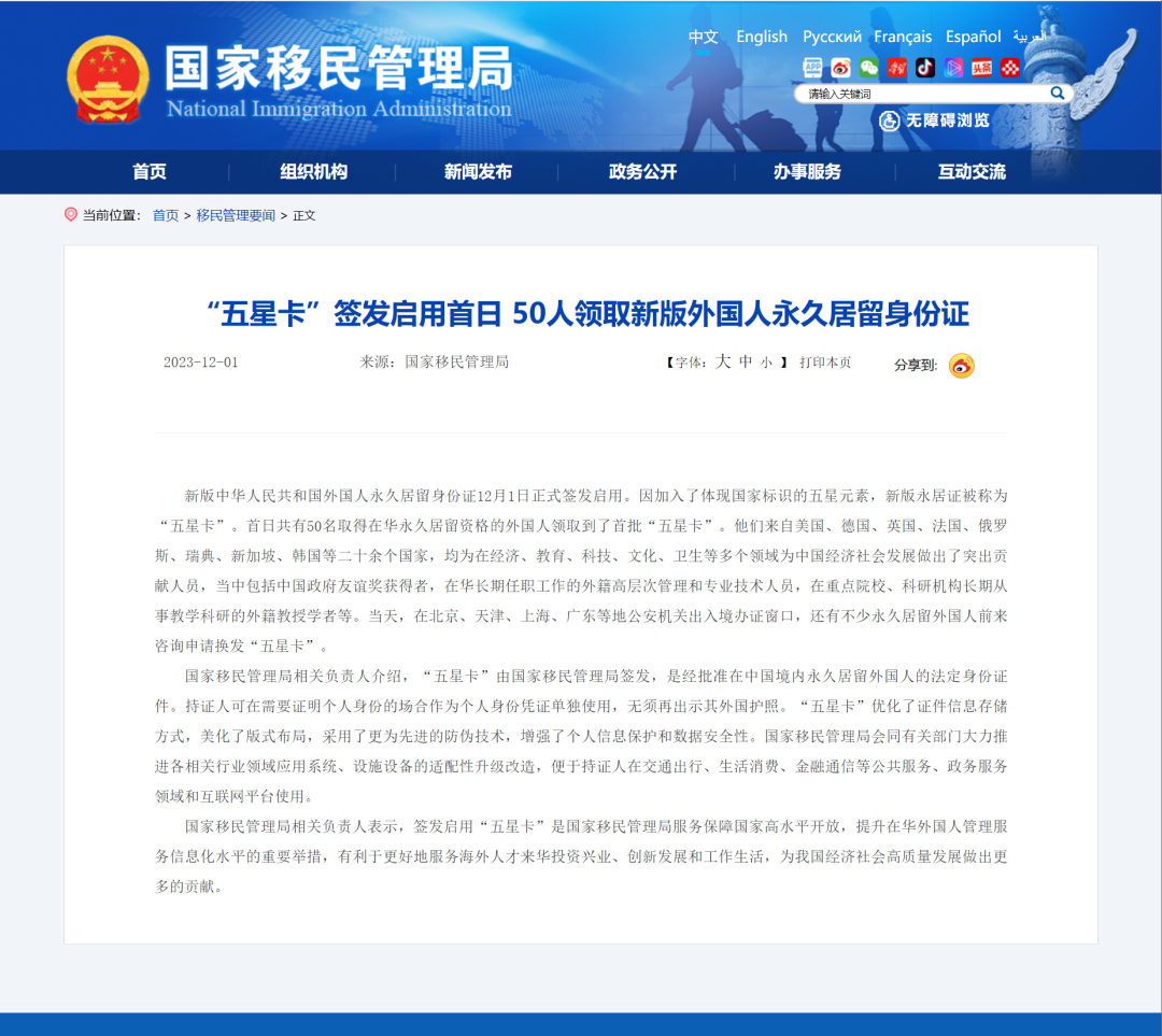 2024年01月22日 12月1日,新版中华人民共和国外国人永久居留身份证正式签发启用,因加入了体现国家标识的五星元素,新版永居证被称为“五星卡”。首日共有50名取得在华永久居留资格的外国人领取到了首批“五星卡”,拾起卖首席信息官杨琳博士正是其中之一。