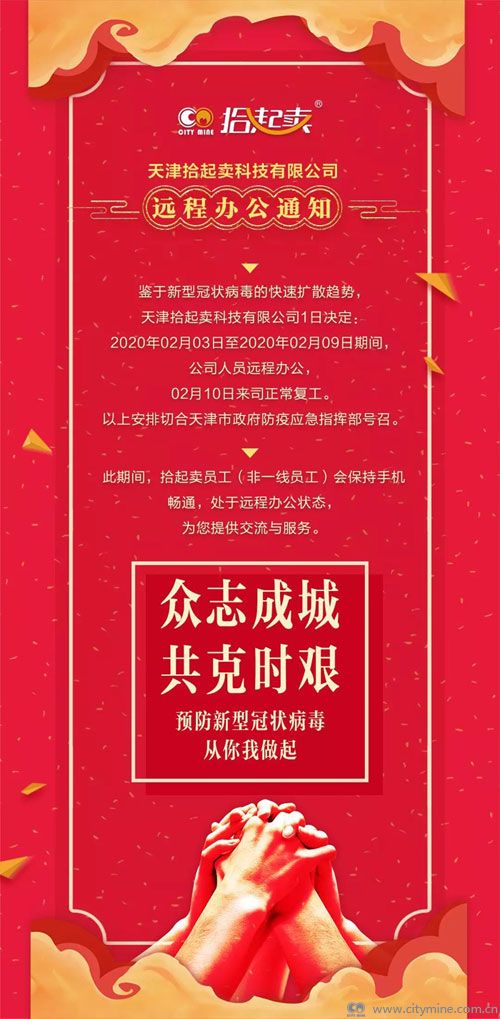 2020年02月03日 目前,新型冠状病毒感染的肺炎疫情防控正处于关键期。截至2月3日13时,天津市累计报告新型冠状病毒感染的肺炎确诊病例56例,病毒仍处于蔓延态势。生命重于泰山,防疫不能懈怠,为了在特殊时期尽所能服务于客户,保证疫情过后复工生产软着陆,天津拾起卖科技有限公司采取特殊时期阶段性远程办公制度,隔绝病毒不隔绝服务;减少会面不减少交流。