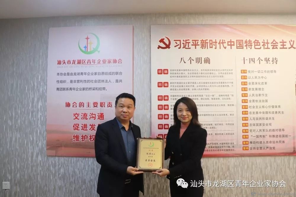 共青团龙湖区委员会副书记苏冰喆向天津潮汕商会常务副会长、天津拾起卖科技有限公司总裁、我会荣誉会长陈奕颁发荣誉会长牌匾