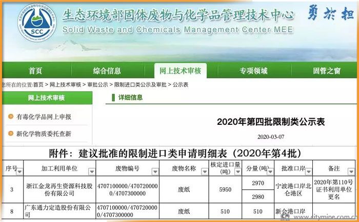 2020年3月7日,固废中心公布的2020年第4批限制进口类申请明细表显示,审核通过广东通力定造股份有限公司废纸核定进口总量为0.0510万吨。其中浙江金龙再生资源科技股份有限公司为2020年第110号证书利用单位更名。