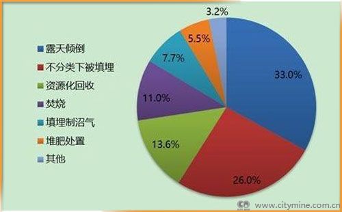 根据世界银行报告,2016年,全球垃圾的末端处置方式有露天倾倒、填埋(不分类、沼气化、控制)、焚烧、堆肥、资源化回收。有33%的垃圾未加处理被露天倾倒,26%的垃圾不分类下被填埋掉,7.7%的垃圾填埋制沼气,11%的垃圾被焚烧,5.5%垃圾堆肥处置,13.6%垃圾进行了资源化回收。