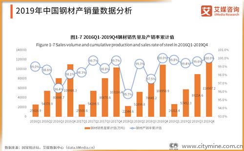 艾媒咨询分析师认为,2019年中国钢材供需基本趋于平衡。相较于2018年,2019年四个季度的销售量累计值均有所增加。至2019年第四季度,中国钢材销售量累计值达118967.2万吨,同比增长9.2%。从钢材产销率累计值看,2019年基本稳定在99%以上。
