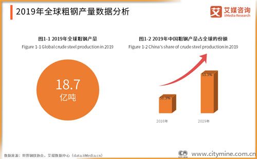 2019年全球粗钢产量达到18.7亿吨,同比增长3.4%。中国占全球粗钢产量的份额从2018年的51.3%上升至2019年的53.3%。艾媒咨询分析师认为,作为钢材最终的加工材料,粗钢是全球基建等重工业发展的重要基础,近几年高铁、地铁等交通行业的发展,推动中国粗钢占据的全球市场份额不断增加。