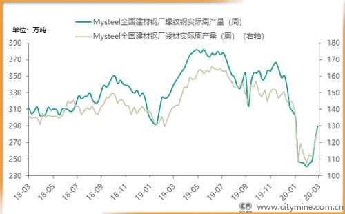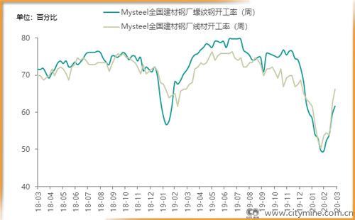 Mysteel调研全国建筑钢材钢厂螺纹钢、线材开工率双双明显回升。截止3月31日,螺纹钢开工率为61.64%,月环比回升12.13%,年同比下降9.51%;线材开工率为66.27%,月环比回升12.42%,年同比持平。国内公共卫生事件明显好转后,企业陆续复工复产,建筑钢材企业复产速度较快。