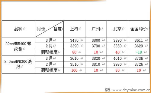 3月份国内建筑钢材均价弱势下跌,但北上广三城价格不同程度反弹。截止31日,上海、广州、北京三城螺纹钢价格月环比分别上涨80元/吨、10元/吨和40元/吨。主要城市螺纹钢全国均价3611元/吨,月环比下跌18元/吨,线材全国均价3736元/吨,月环比上涨10元/吨。可见,开市后,各地区压力不一,区域间分化明显。