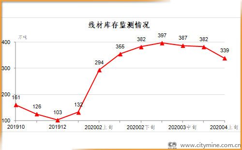 4月上旬,线材库存339万吨,比上一旬减少42万吨,下降11.1%;比上年12月增加236万吨,上升229.1%。