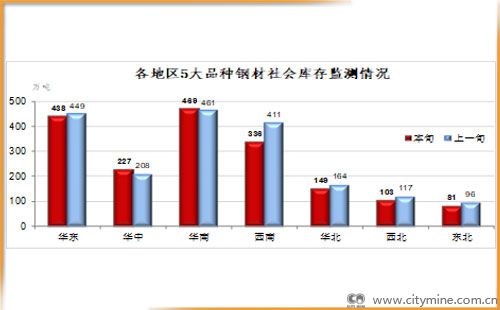 4月上旬,分地区来看,华中和华南地区钢材库存较上一旬有所增加,数量分别为18万吨和8万吨;其他区域均呈下降趋势。降幅较大的地区仍为西南,比上一旬下降18.3%,东北和西北分别下降15.0%和12.1%,其他区域降幅不大。
