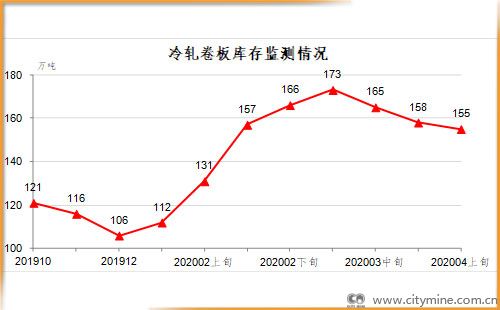 4月下旬,冷轧卷板库存155万吨,比上一旬减少4万吨,下降2.4%;比上年12月增加49万吨,上升46.2%。