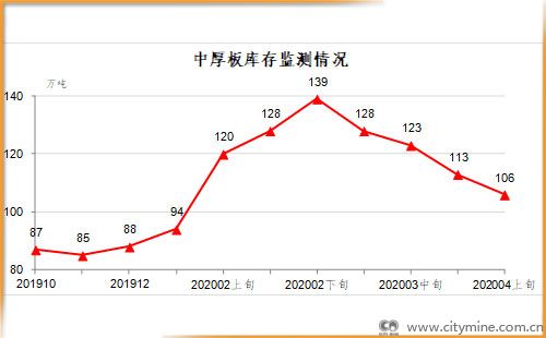 4月上旬,中厚板库存106万吨,比上一旬减少7万吨,下降6.4%;比上年12月增加18万吨,上升20.5%。