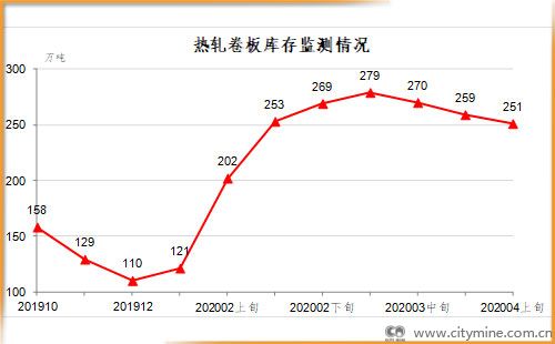 4月上旬,热轧卷板库存251万吨,比上一旬减少8万吨,下降3.0%;比上年12月增加141万吨,上升128.2%。
