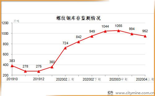4月上旬,螺纹钢库存952万吨,比上一旬减少42万吨,下降4.2%;比上年12月增加677万吨,上升246.2%。