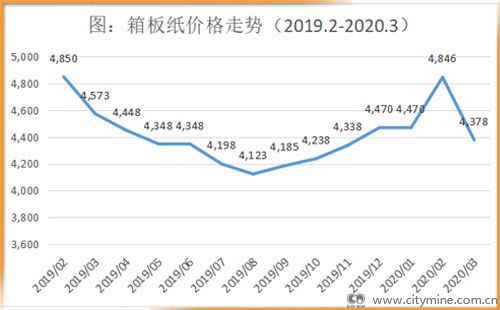 另据纸业联讯及国家统计局一季度公布的造纸行业运行数据分析,2020年1-2月份,国内造纸行业产量约为1435万吨,同比下降15.11%,3月份造纸产量约为1000万吨,同比下降5%。一季度造纸总产量约为2435万吨,同比下降11.3%。一季度国内包装纸平均价格约为4612元/吨,同比下降3.8%,3月份跌幅较大,较2月份下跌9.8%,见下图。