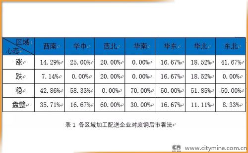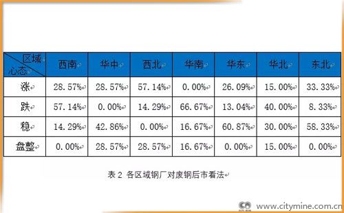 本周各区域废钢加工配送企业和钢厂对短期废钢市场的看法基本以稳为主。稳中偏弱,加工配送企业持稳心态强于钢企,钢企跌价情绪较强的区域是华南、西南、华北。