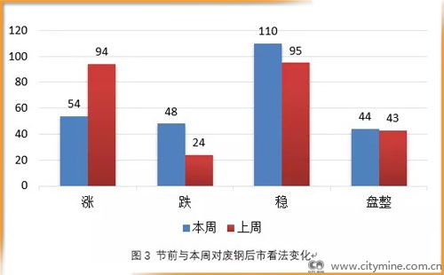 在调研的159家企业和97家钢厂中,本周持涨价观点的钢企较上周明显减少,持跌价、稳价和盘整观点的钢企较上周有所增加。