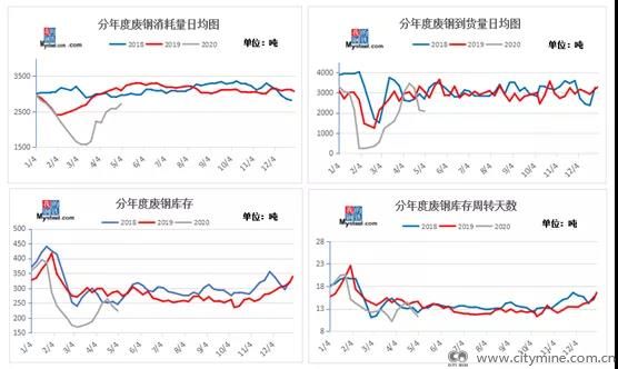 截止4月23日,我的钢铁61家钢厂废钢库存总量223.55万吨,较上周降15.69万吨,降6.56%;周转天数11.3天,降1.3天。截止4月23日本周我的钢铁61家钢厂废钢日均到货量2081.67吨,较上周降2.04%;日均消耗量2712.5吨,较上周增4.8%。上周钢厂库存续降,钢厂拉涨吸货,但未能解决日均到货不及日耗的情况。
