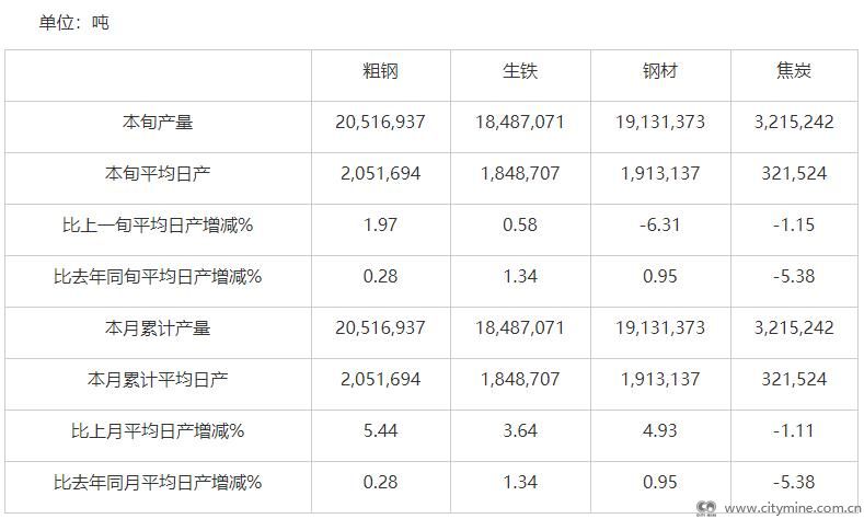 2020年05月14日2020年5月上旬,重点统计钢铁企业共生产粗钢2051.69万吨、生铁1848.71万吨、钢材1913.14万吨、焦炭321.52万吨。本旬平均日产,粗钢205.17万吨,环比增长1.97%、同比增长0.28%;生铁184.87万吨,环比增长0.58%、同比增长1.34%;钢材191.31万吨,环比下降6.31%[1]、同比增长0.95%。