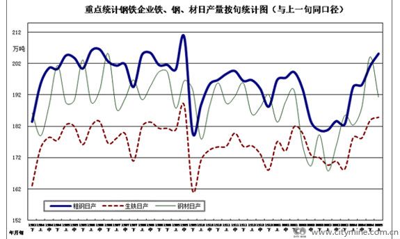 本月重点统计钢铁企业累计平均日产粗钢205.17万吨,环比增长5.44%、同比增长0.28%;生铁184.87万吨,环比增长3.64%、同比增长1.34%;钢材191.31万吨,环比增长4.93%、同比增长0.95%。