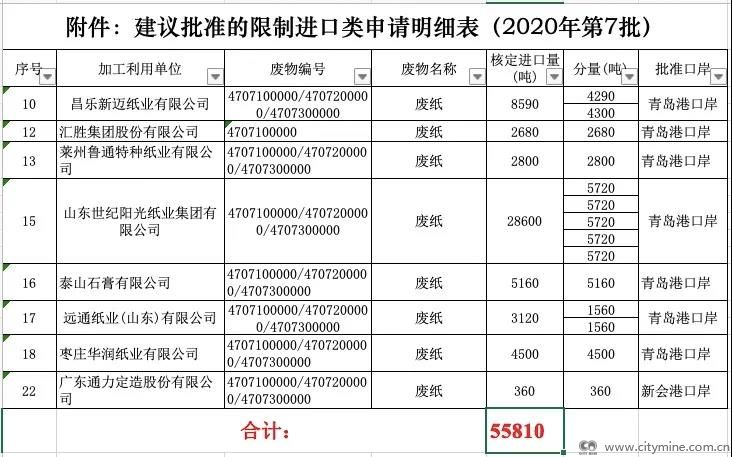 2020年5月18日,固废中心公布的2020年第七批限制进口类申请明细表显示,审核通过了昌乐新迈纸业有限公司,汇胜集团股份有限公司,莱州鲁通特种纸有限公司,山东世纪阳光纸业有限公司,泰山石膏有限公司,远通纸业(山东)有限公司,枣庄华润纸业有限公司,广东通力定造股份有限公司,共计废纸核定进口总量为5.581万吨。