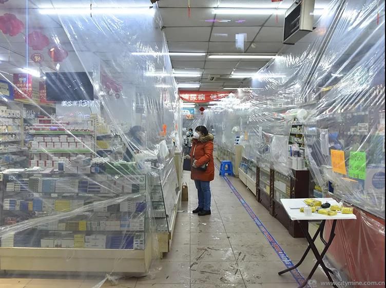 新冠疫情加剧了公众对于塑料的使用。2020年3月3日,长春,疫情防控升级,药房用塑料薄膜围起柜台,防止与买药人正面接触。 (人民视觉/图)