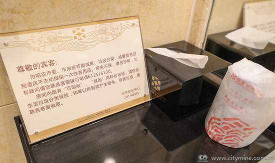 北京会议中心垃圾管理办公室主任刘继东介绍,北京会议中心驻地从去年8月起就开始推行分类措施,取得良好成效。此次作为全国两会驻地之一,今年他们又采取了不少新的举措,进一步减少垃圾总量。客房内摆放垃圾分类宣传册,指导入住人员进行垃圾分类。在卫生间和电视机柜旁,还并分别放置“可回收物”和“其他垃圾”两个垃圾桶。