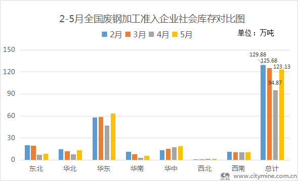 截止5月22日,Mysteel调研289家废钢铁加工准入企业,其中剔除钢厂直属废钢公司后,未加工原料及成品库存量合计123.13万吨,较上月同期库存总量增加29.79%。未加工原料库存总量47.73万吨,较上月同期样本数据增加45.77%,其中华中增221.26%、华北增87.77%、华南增62.35%、华东增26.82%、东北增21.98%;已生产成品库存总量77.84万吨,较上月同期样本数据增加25.08%,其中华南增116.30%、华北增66.98%、华东增50.99%、华中降23.25%。对比数据体现了当前不论是原料亦或成品资源方面呈现累积状态,废钢价格良好走势下供货商囤货意愿加强,增加了废钢后期的回落风险。