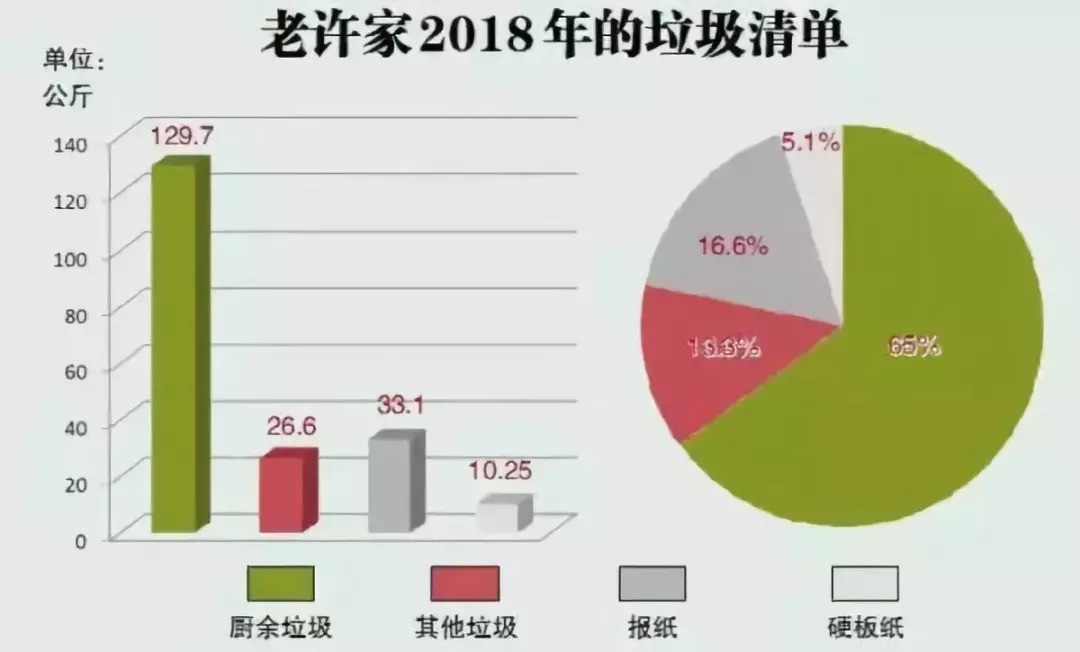 这份清单显示,许伟平夫妻2018年共产生垃圾约200公斤,其中厨余垃圾约129.7公斤、报纸33.1公斤、硬板纸10.25公斤、其他垃圾26.6公斤。