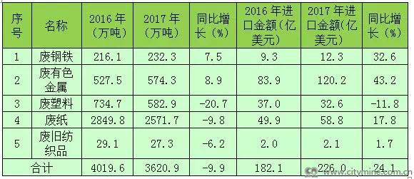 2017年,我国废钢铁、废有色金属、废塑料、废纸、废旧纺织品五大类别的再生资源进口总量3620.9万吨,同比下降9.9%。其中降幅最大的是废塑料,同比下降20.7%。废旧纺织品进口量与2016年相比,减少6.2%。再生资源进口量下降主要是由于《禁止洋垃圾入境推进固体废物进口管理制度改革实施方案》等一系列政策对行业产生的影响逐渐显现。