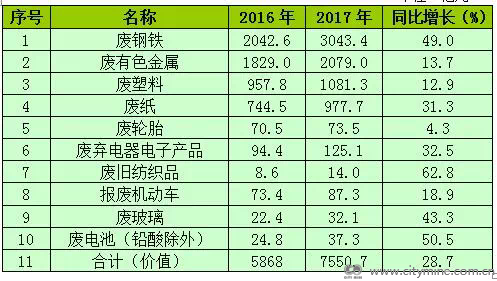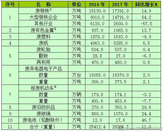 截至2017年底,我国废钢铁、废有色金属、废塑料、废轮胎、废纸、废弃电器电子产品、报废机动车、废旧纺织品、废玻璃、废电池十大类别的再生资源回收总量为2.82亿吨,同比增长11%。其中,废电池、废玻璃、废旧纺织品回收量增幅较为明显,分别增长46.7%、24.4%和29.6%;废塑料和报废机动车回收量出现下滑,分别同比减少9.9%和7.7%。
