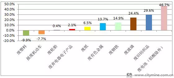 △ 图1 2017年主要再生资源品种回收量同比增长情况