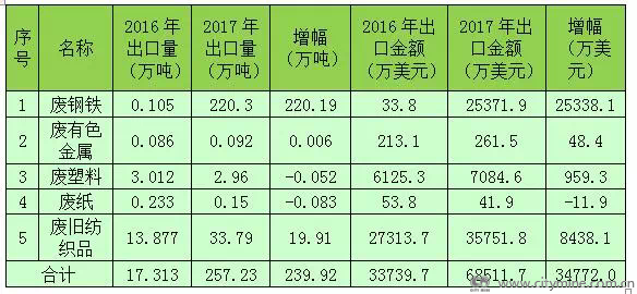 2017年,我国废钢铁、废有色金属、废塑料、废纸、废旧纺织品五大类别的再生资源共出口257.23万吨,较上年增长239.92万吨。其中,增加最多的是废钢铁,较上年增加了220.19万吨。原因方面,主要是由于政府取缔“小作坊”式的中频炉生产“地条钢”,使得废钢铁资源阶段性过剩,出口成为消化过剩产能的新途径。