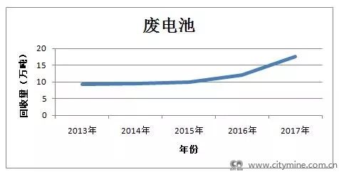 2017年,废电池(铅酸电池除外)回收量约为17.6万吨,同比增长46.7%。其中:废一次电池回收量约为3万吨,废二次电池回收量约为14.6万吨。在消费环节,目前废一次电池散布在城市生活垃圾中,逐年积累,从环境保护要求考虑,亟待研究经济可行的回收利用技术,在有条件的地区建立规范的废电池回收体系。