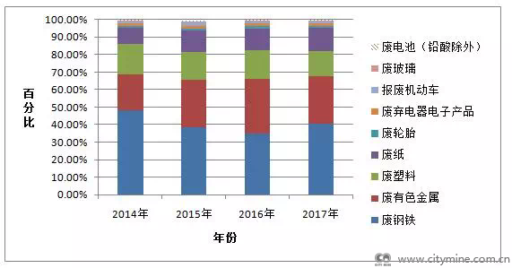 △ 图3 2014-2017年主要再生资源类别回收价值占比图